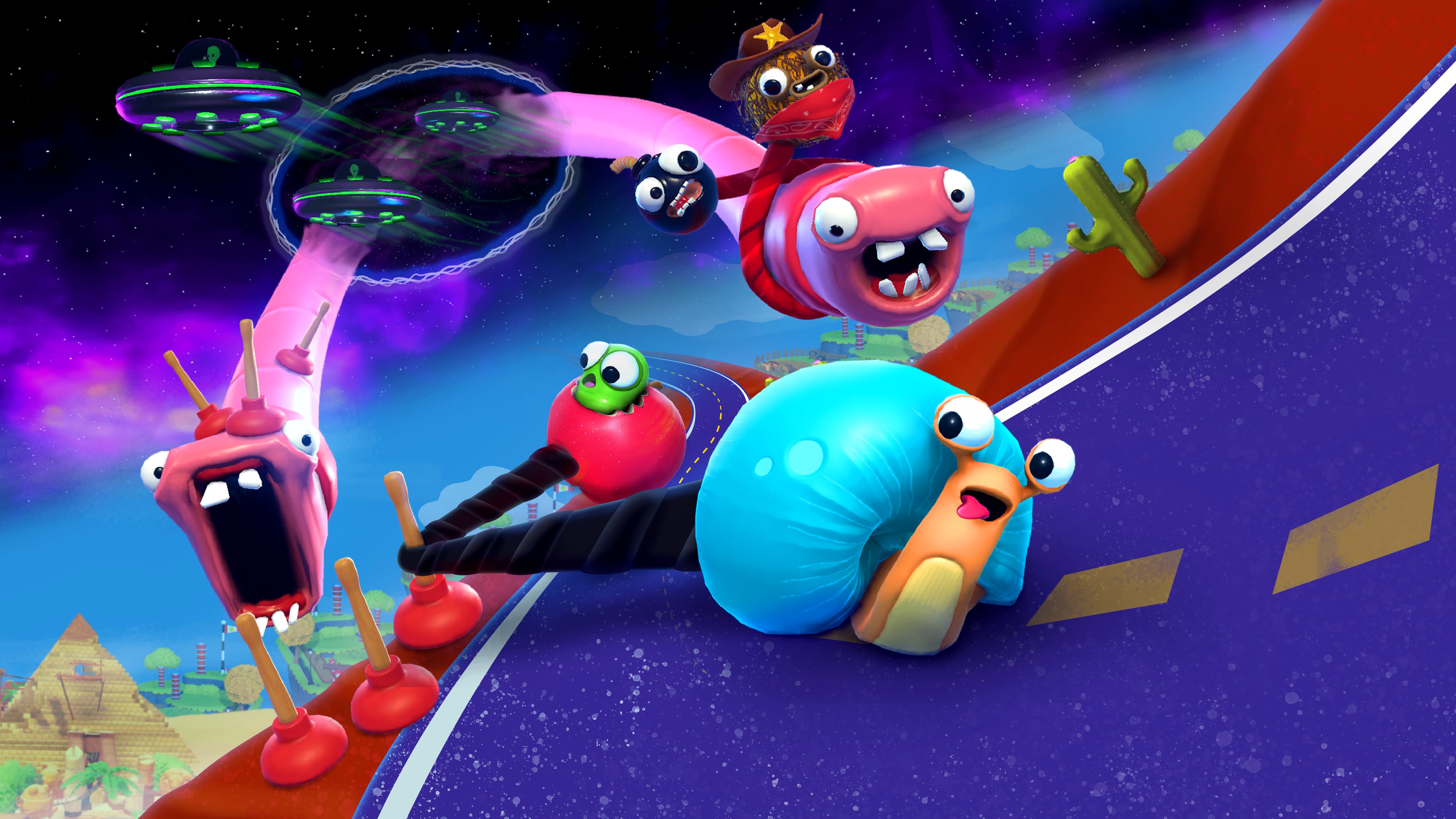 WHAT IS IT? In Fling to the Finish, teams of two players race through colorful, chaotic obstacle courses while tethered by a stretchy elastic rope. When you and your friends first pick up the game your rope will get tangled in practically everything you pass. But as you quickly improve your communication skills you'll learn that the rope is your biggest asset. Experienced players can use the rope to swing around perilous obstacles, and fling their partner up ledges before they fall to their doom. When partners master using their rope, they're capable of acrobatic feats unachievable in any other platformer! Teams can show off their skills by competing in online or local races with a bunch of other players! WAYS TO PLAY Play solo or online. Be tethered together in local or online Co-Op. Race your friends in local Splitscreen. Enjoy the chaos of Fling to the Finish in a way that fits you. COURSES! Every course in Fling to the Finish has a unique theme and style. Race through floating parks, giant casinos, and even worm filled asteroid fields to reach the finish line! We designed every obstacle to force you to use the rope in a new way, so every second is filled with new surprises and memorable moments. The race track even evolves to challenge you as you play, so every race is a nail biter. You'll never know what weird obstacle you'll find next. ATTACKS! Opponents battle back with hails of plungers, sinking weights, and evil lasers if they fall behind. Our items keep the races interesting, and help even the score if one player has more experience than another. SHARE A CONTROLLER Because you're literally attached to your partner, Fling to the Finish is a truly cooperative experience. If you want, you can even play through Fling to the Finish by sharing a controller with your partner. This control scheme is great for local co-op, and adds an extra dimension to the game. While you push and pull each other in game, try not to do the same in real life!