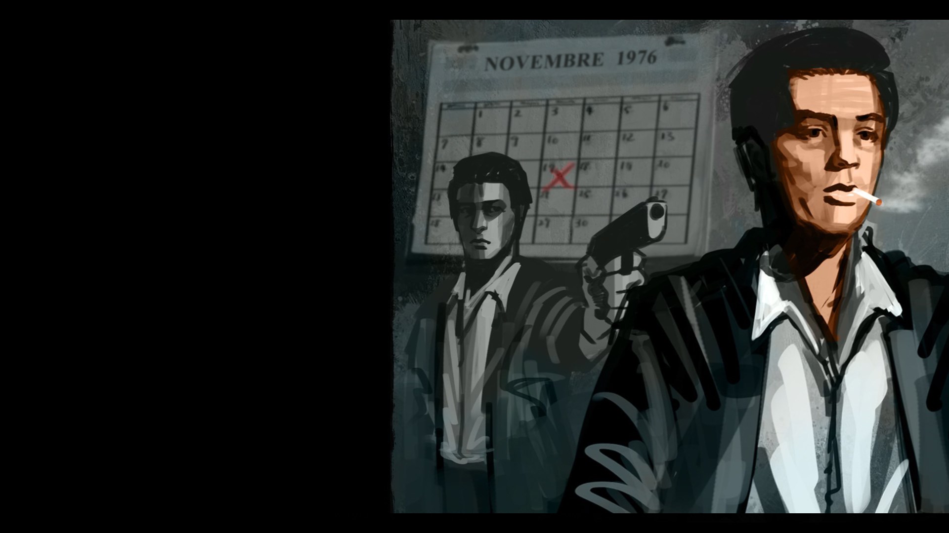 As a professional killer you'll live through November 1976 alternating non-stop shoot'em up action with a downtempo mundane life.